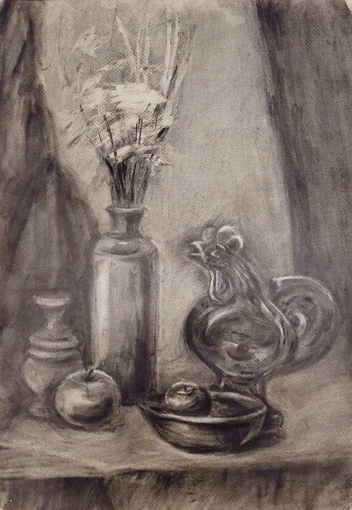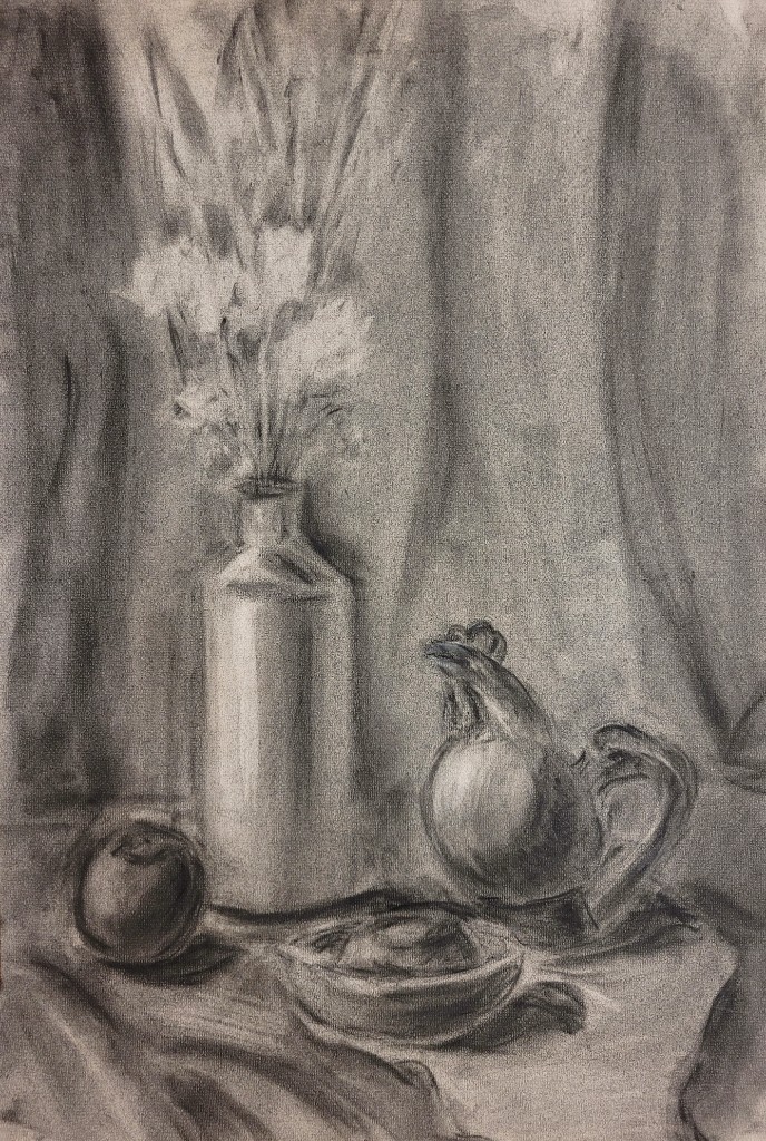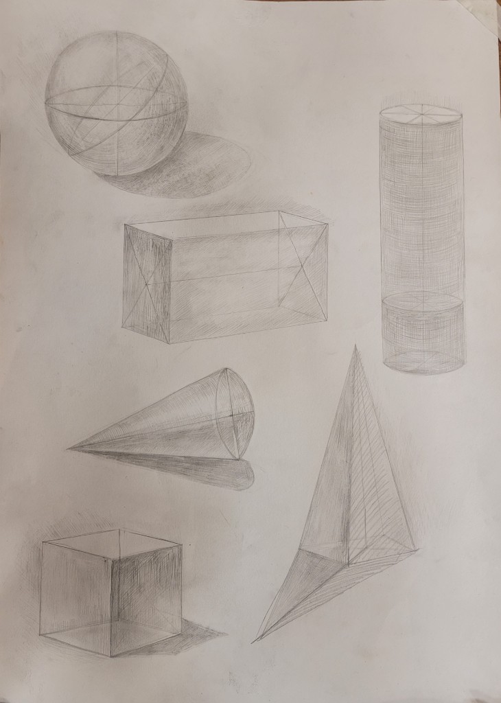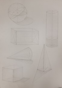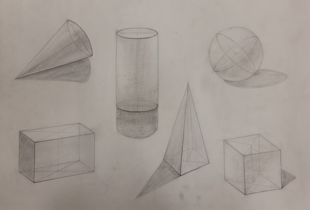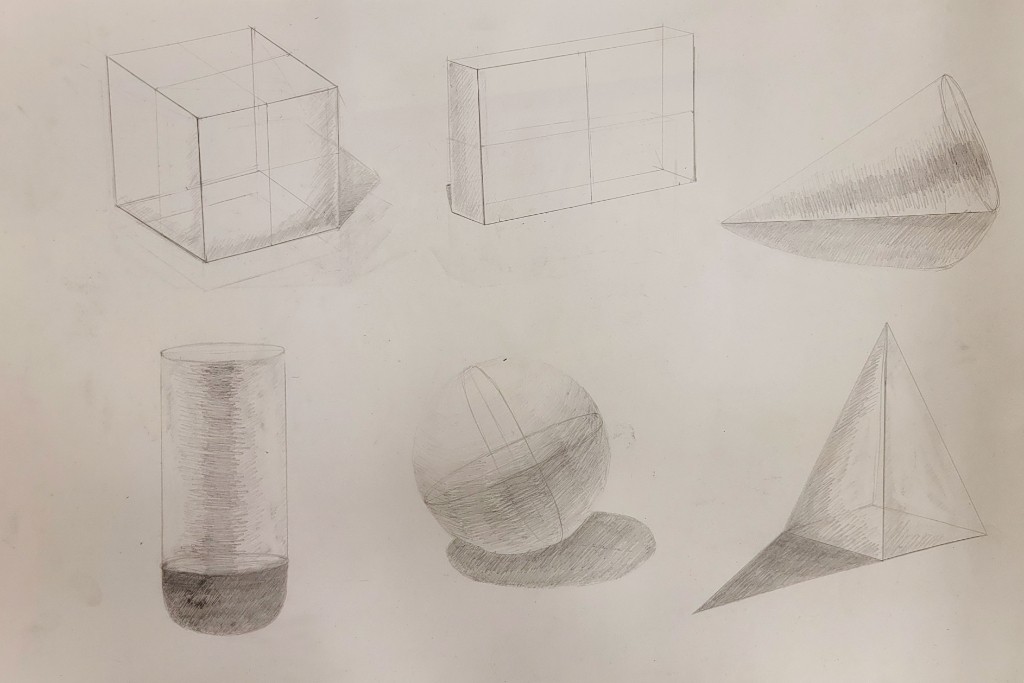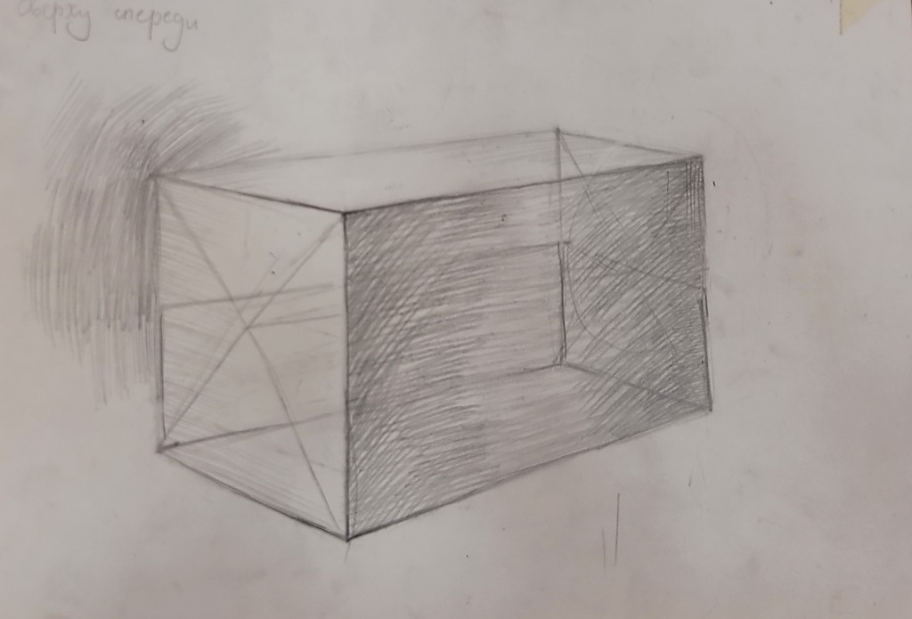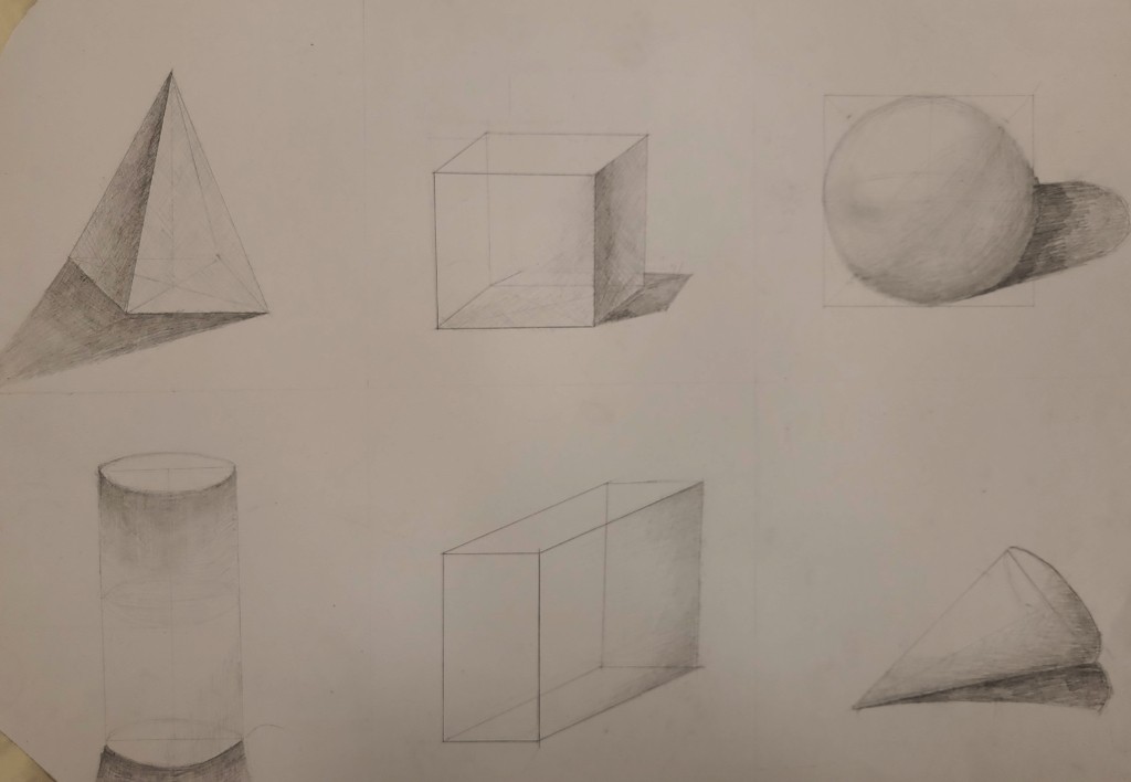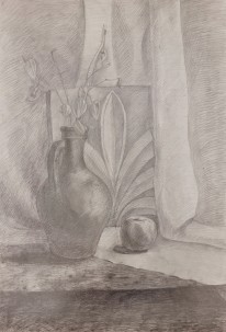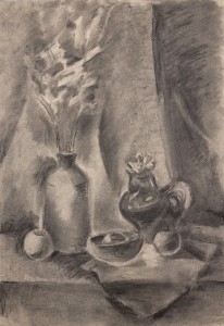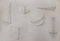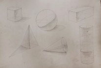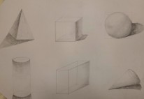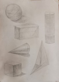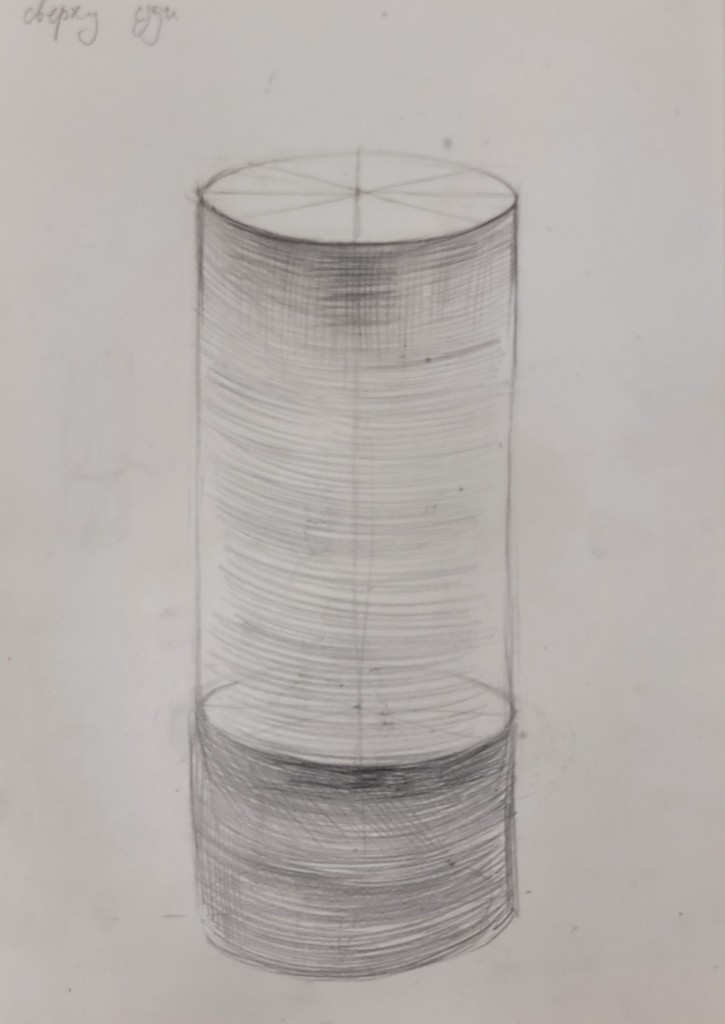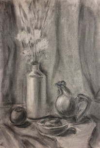 На вставке представлены работы детей 13–14 лет, выполненные графитным карандашом и угольной пудрой с натуры (натюрморты) и по представлению (геометрические тела с заданным источником света).
