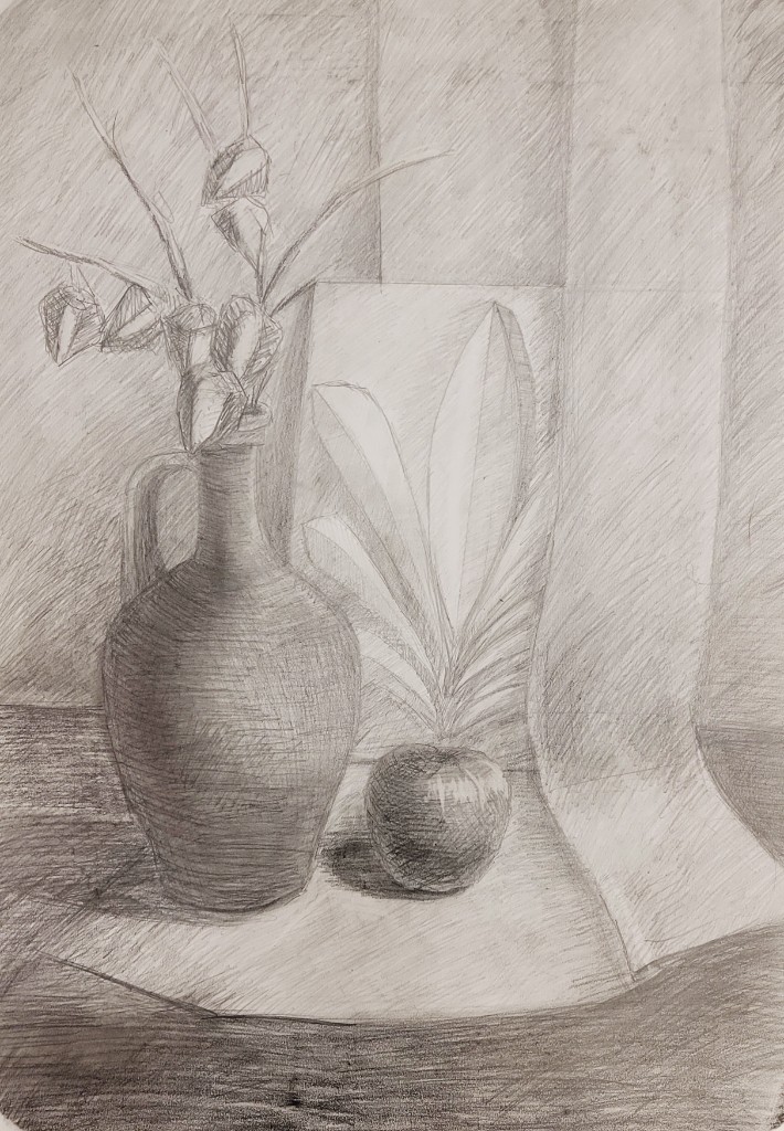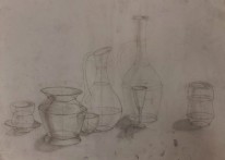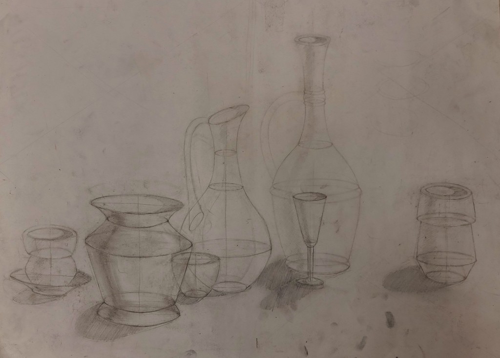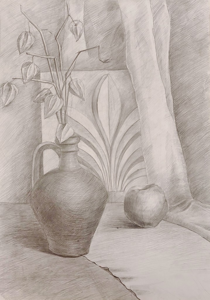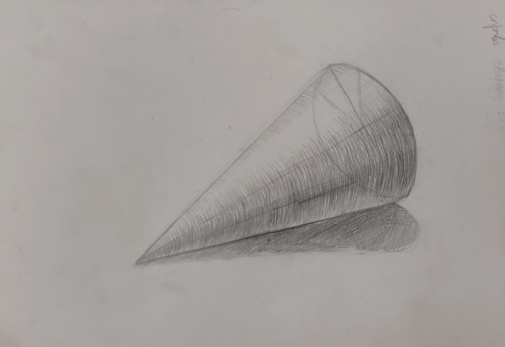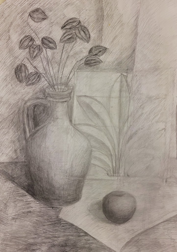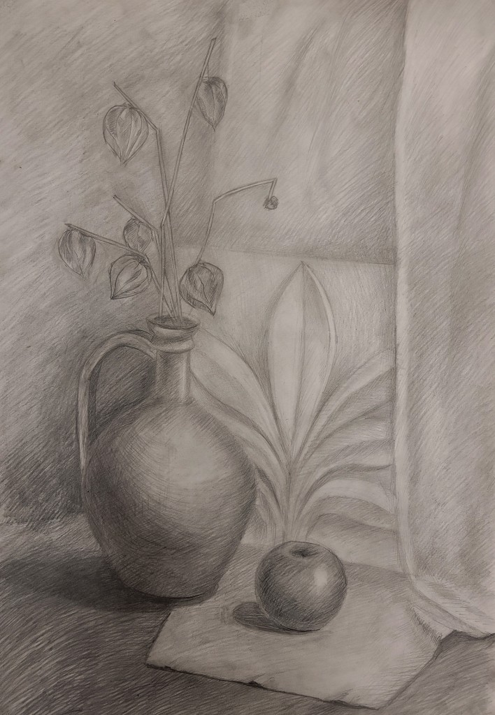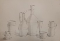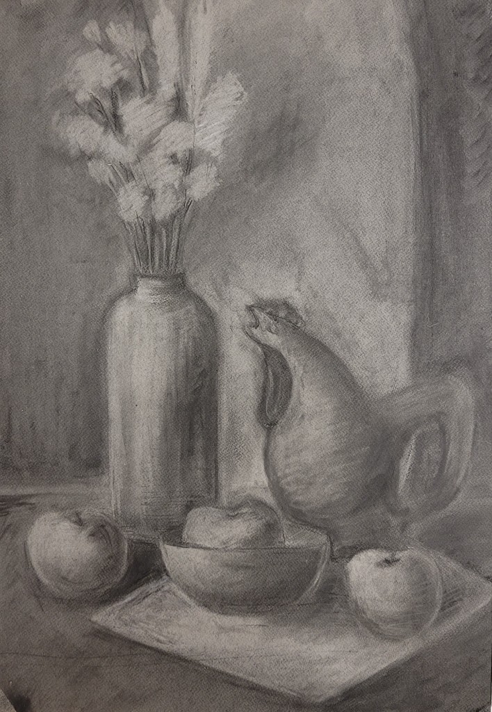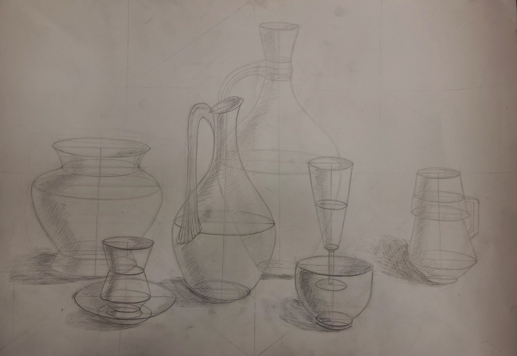 На вставке представлены работы детей 13–14 лет, выполненные графитным карандашом и угольной пудрой с натуры (натюрморты) и по представлению (геометрические тела с заданным источником света).