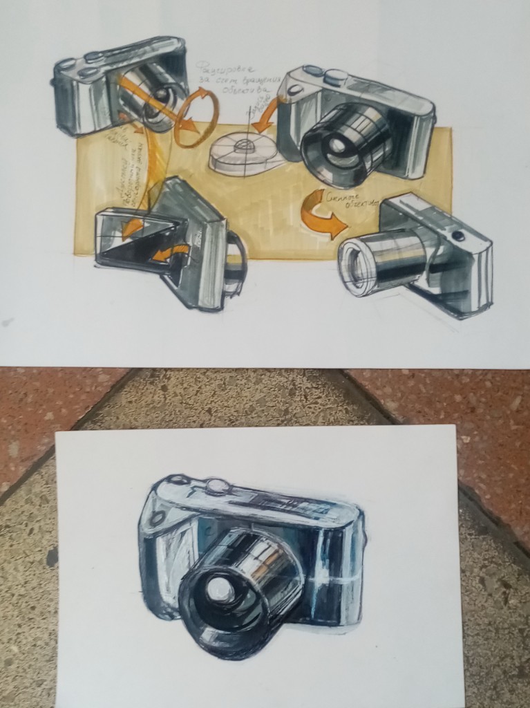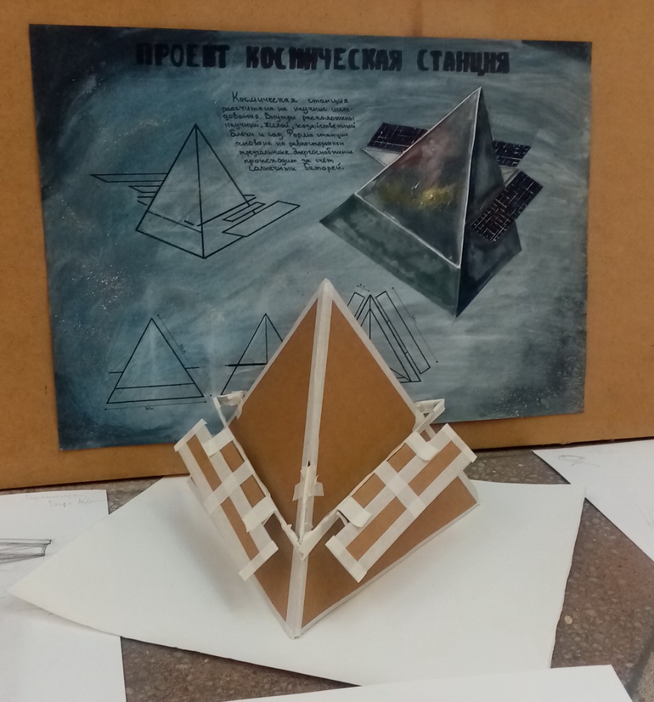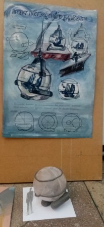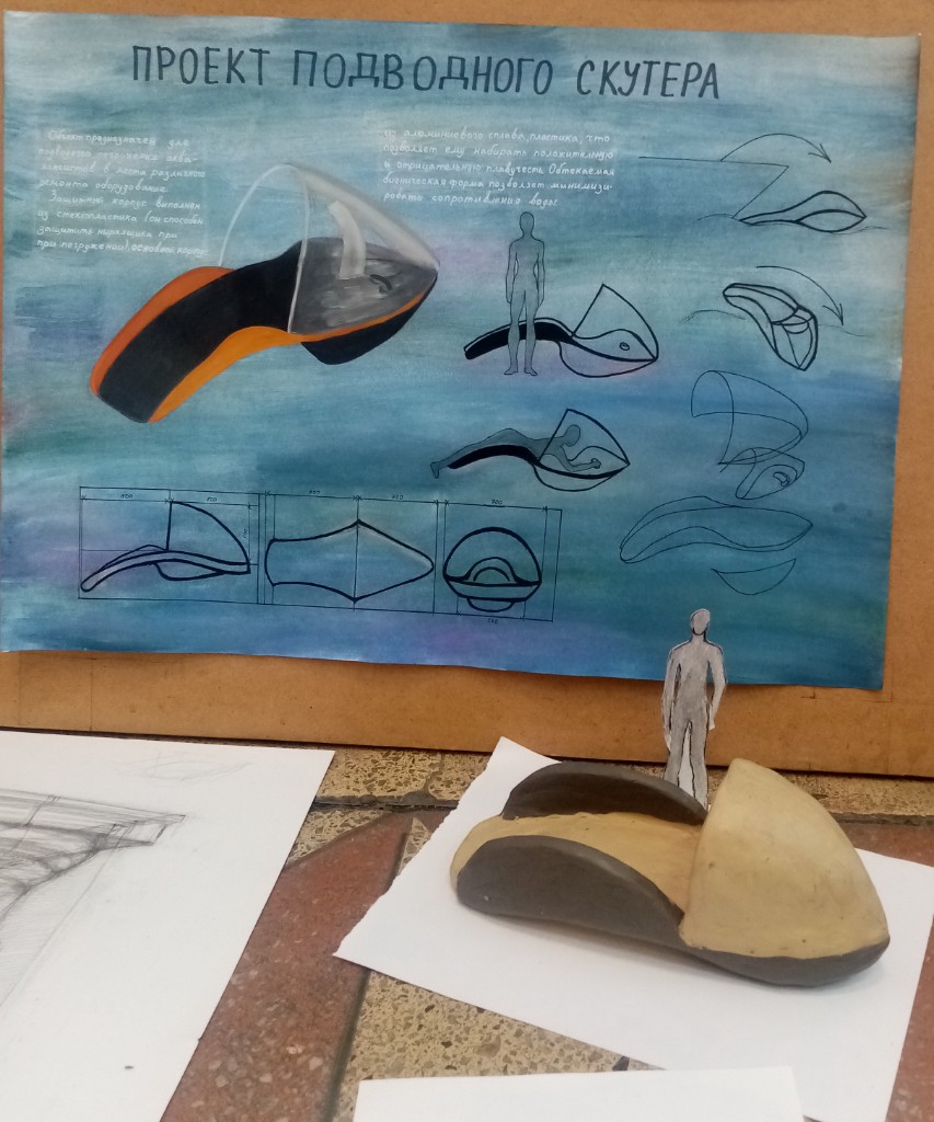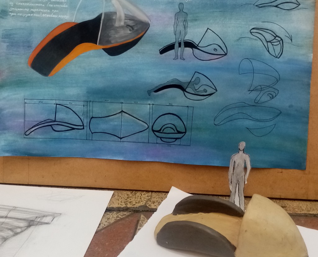 По основам дизайна ребята выполняли проект транспортного средства. Ворошилина Варвара, вдохновляясь пирамидами Древнего Египта и их назначением спроектировала космическую станцию в форме тетраэдра, энергоснабжение которой происходит за счет солнечных батарей [Рис.2]. Для любителей подводных красот Лазарева Дарья представила прогулочный батискаф с улучшенным панорамным обзором за счет размещения входного люка снизу, интегрировав его рядом с панелью управления [Рис.7]. Павлова Маргарита спроектировала внешнюю оболочку аква-скутера, используя бионическую форму инфузории-туфельки [Рис.12], создав тем самым комфортные условия для перемещения аквалангистов. Марьяна Чистякова разработала принцип действия и винтовых движений внешнюю оболочку средства передвижения по льду, которое за счет круговых движений винтов в нижней части корпуса и баллонов может передвигаться как по льду, так и по воде. Данное средство может использоваться на реках в период таяния льда.