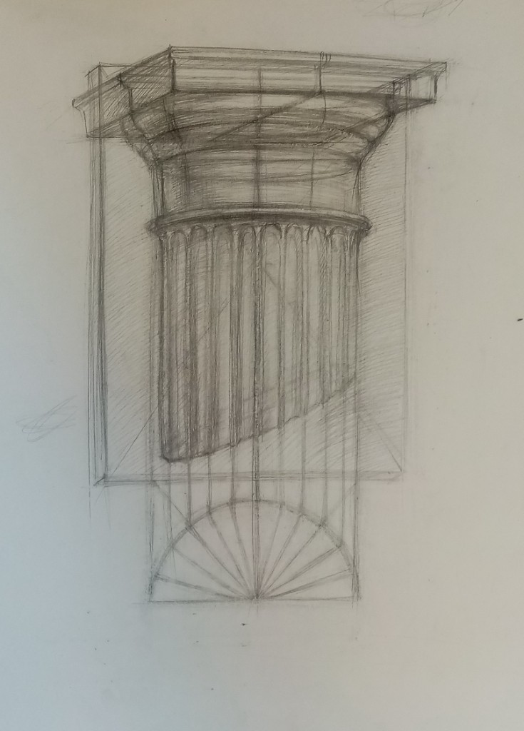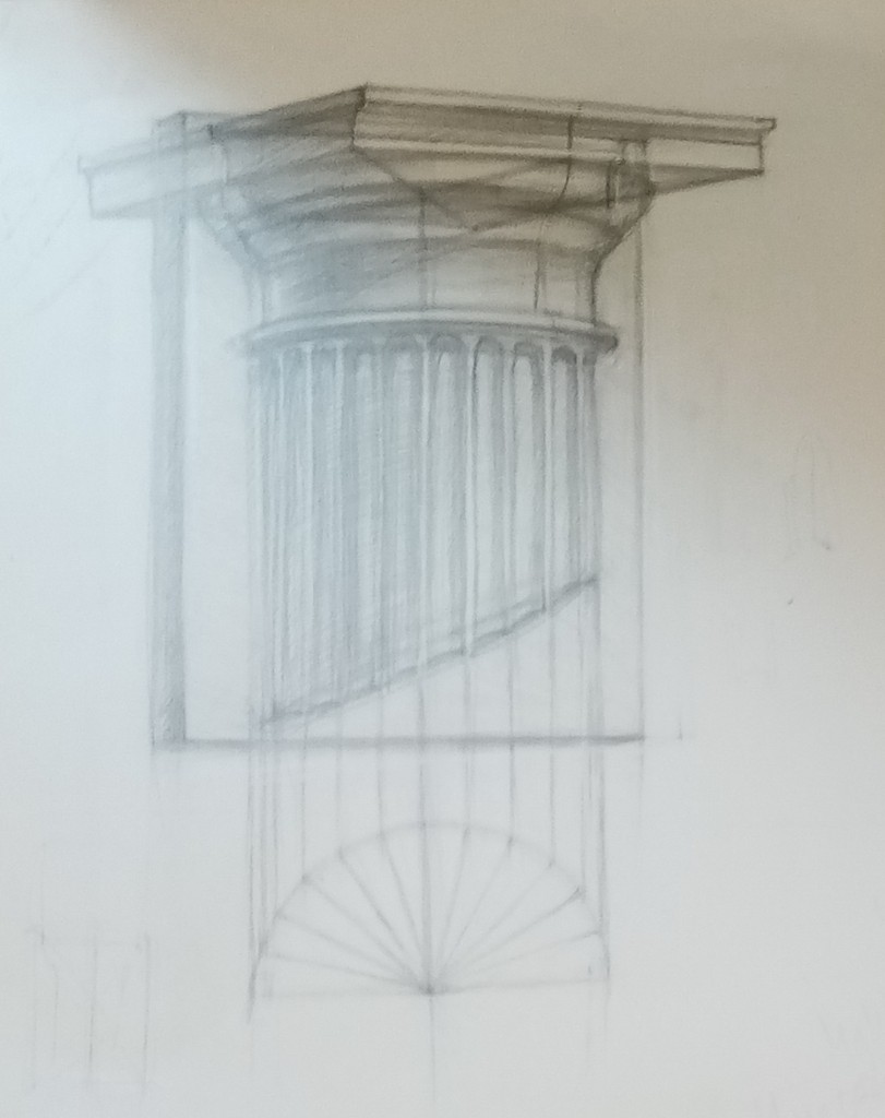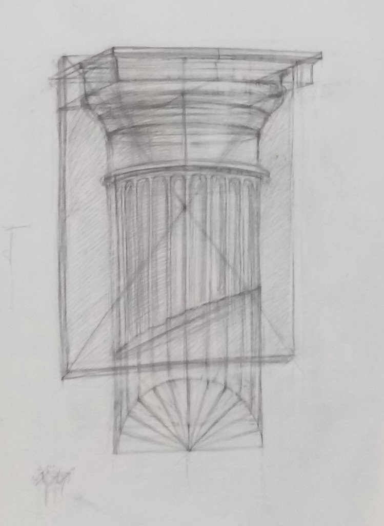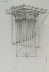 В втором полугодии 4-ого класса ребята продемонстрировали задания по рисунку, живописи, основам дизайна и проектной графики. Рисунок представлял собой конструктивно-пластический анализ полукапители. Вполне уверенно работы получились у Лазаревой Дарьи [Рис.6] и Чистяковой Марьяны [Рис.16].