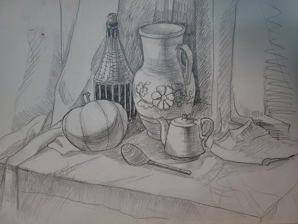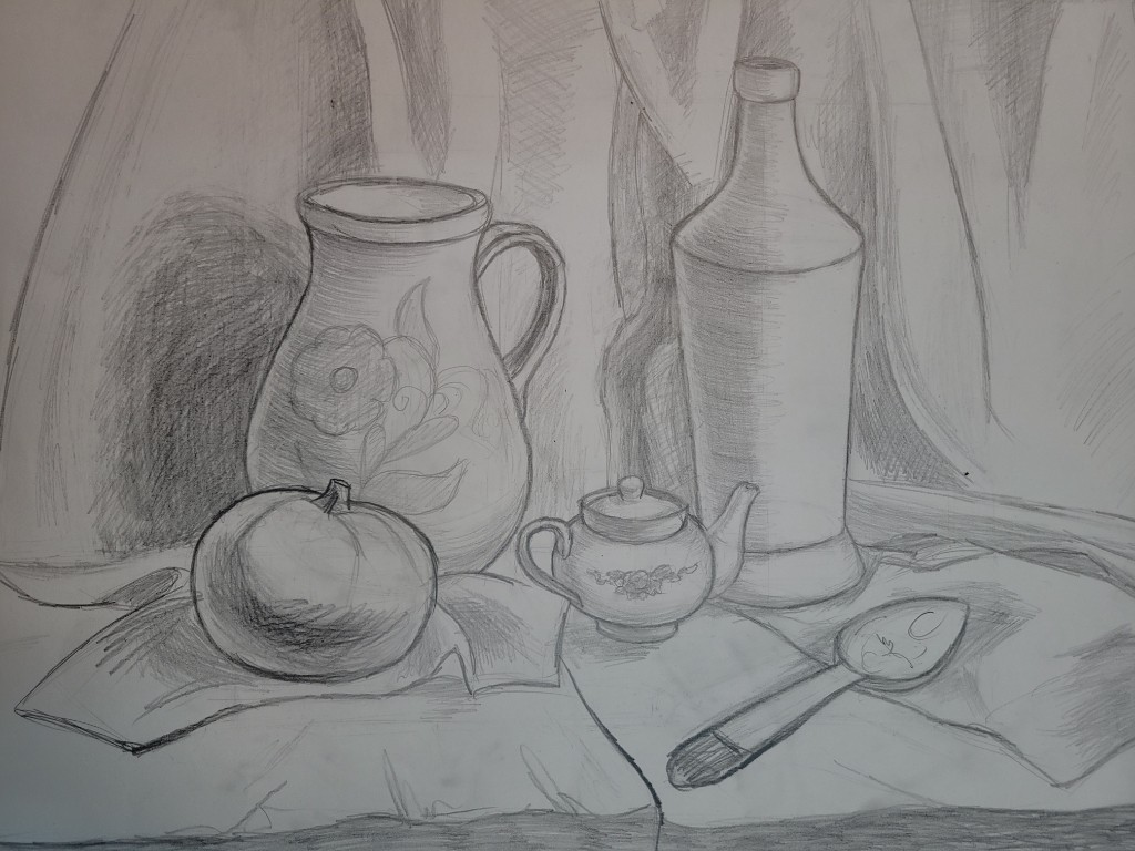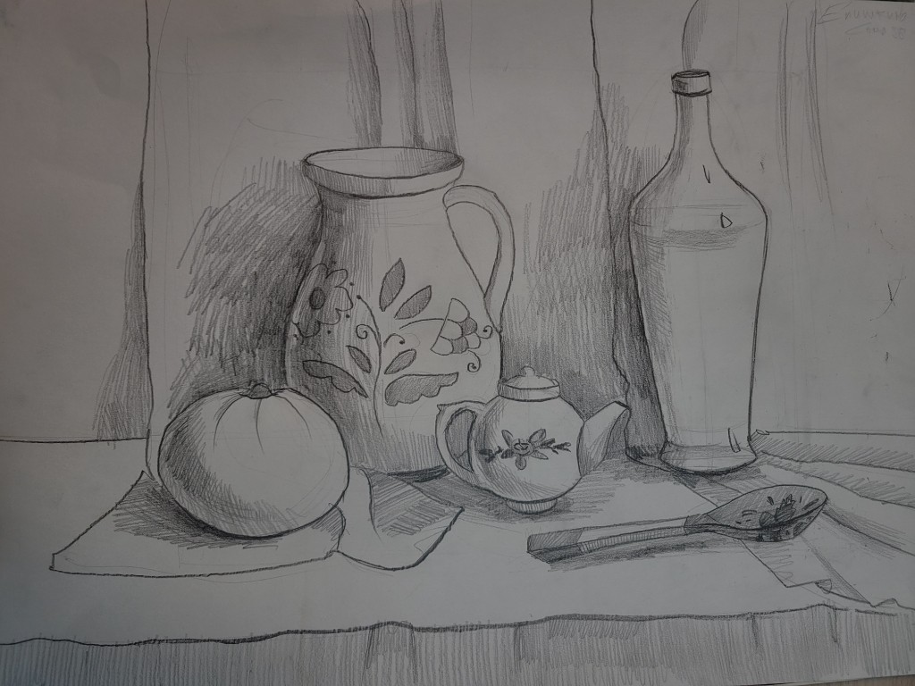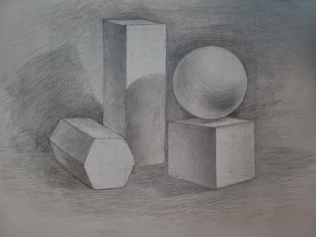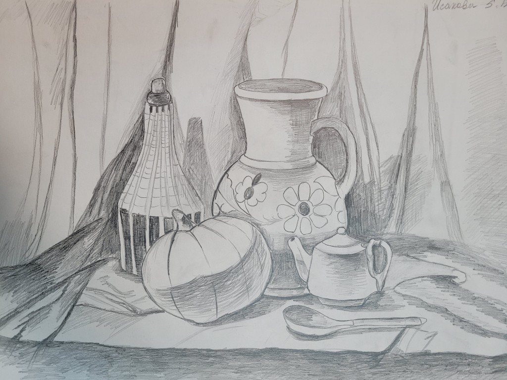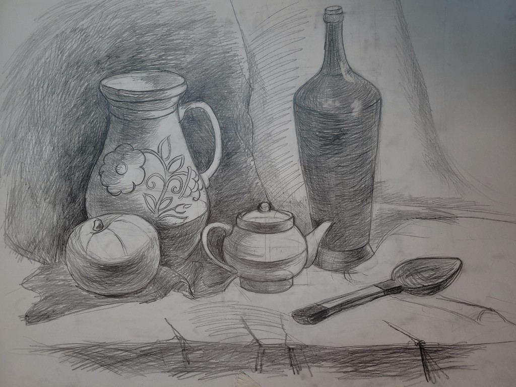 Работы созданы в техниках простого карандаша и соуса. Эти материалы позволили юным авторам решать сложные тональные задачи: от мягкой светотеневой моделировки до жесткой пластической проработки формы. В экспозицию вошли натюрморты из бытовых предметов, демонстрирующие понимание фактур и материальности, а также натюрморты из гипсовых фигур, где от учащихся требовалось точное конструктивное построение и владение анатомическими основами. Каждый лист — результат серьезной академической работы и шаг в освоении профессионального графического языка