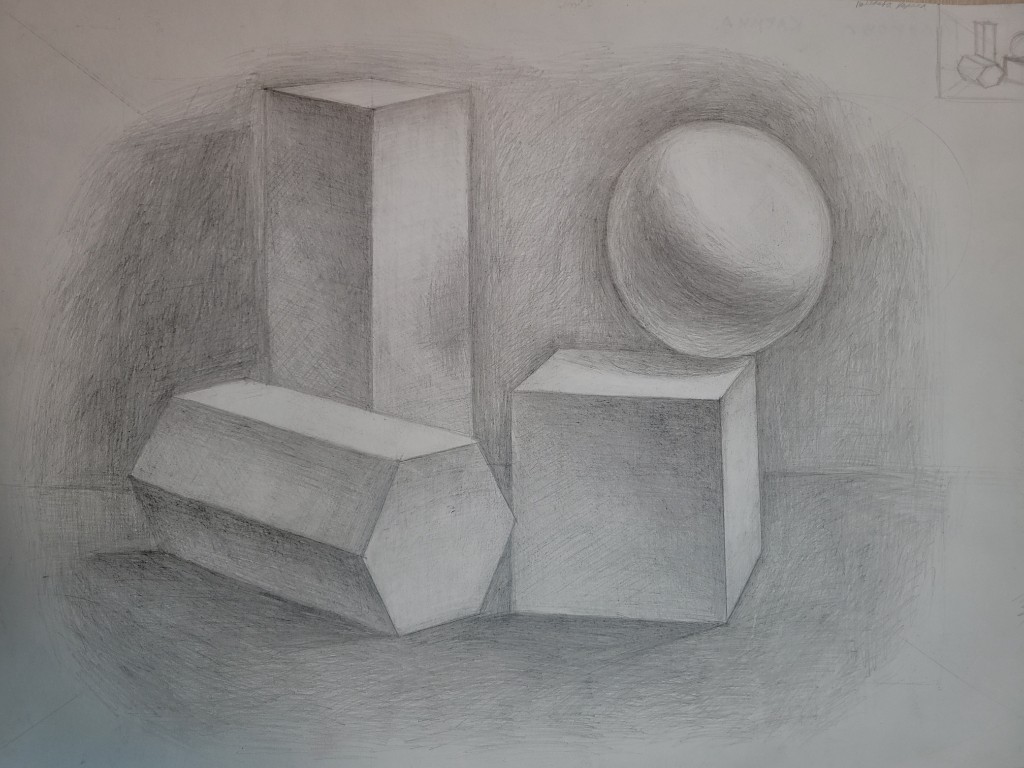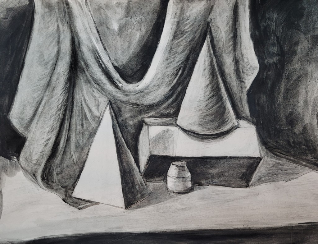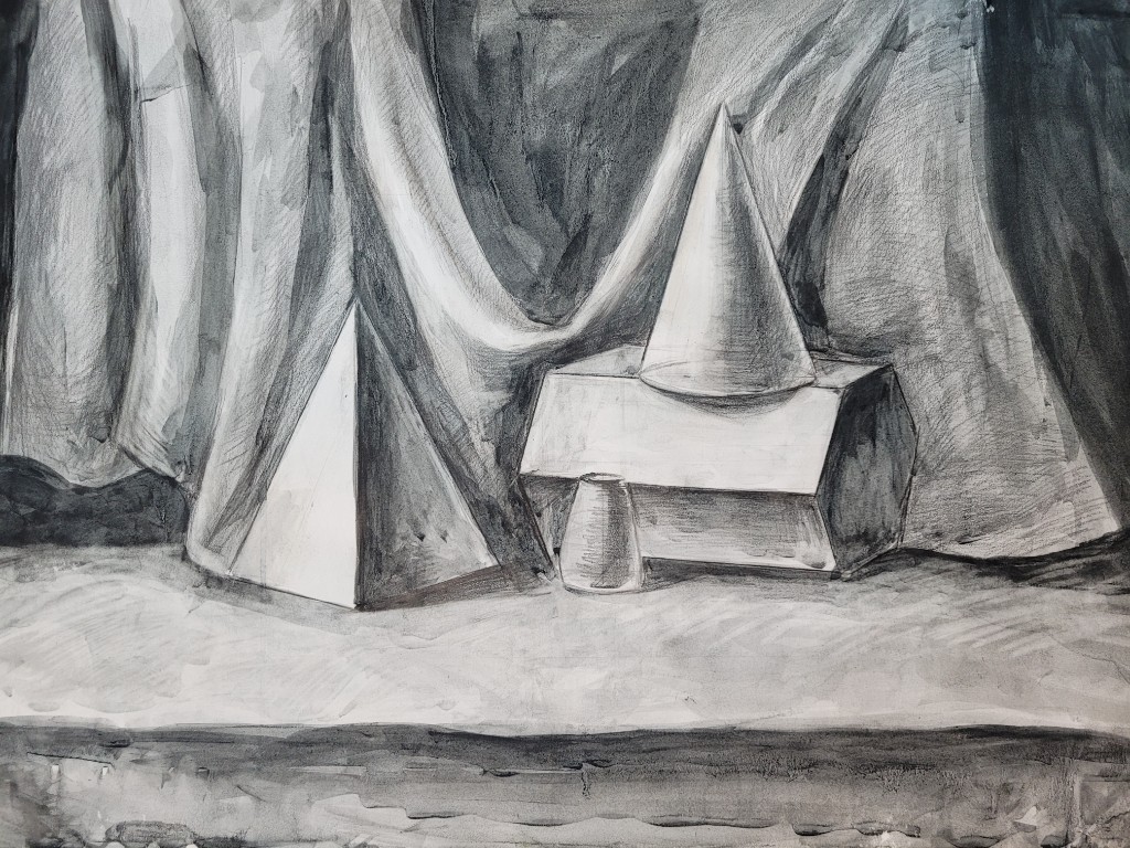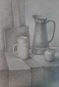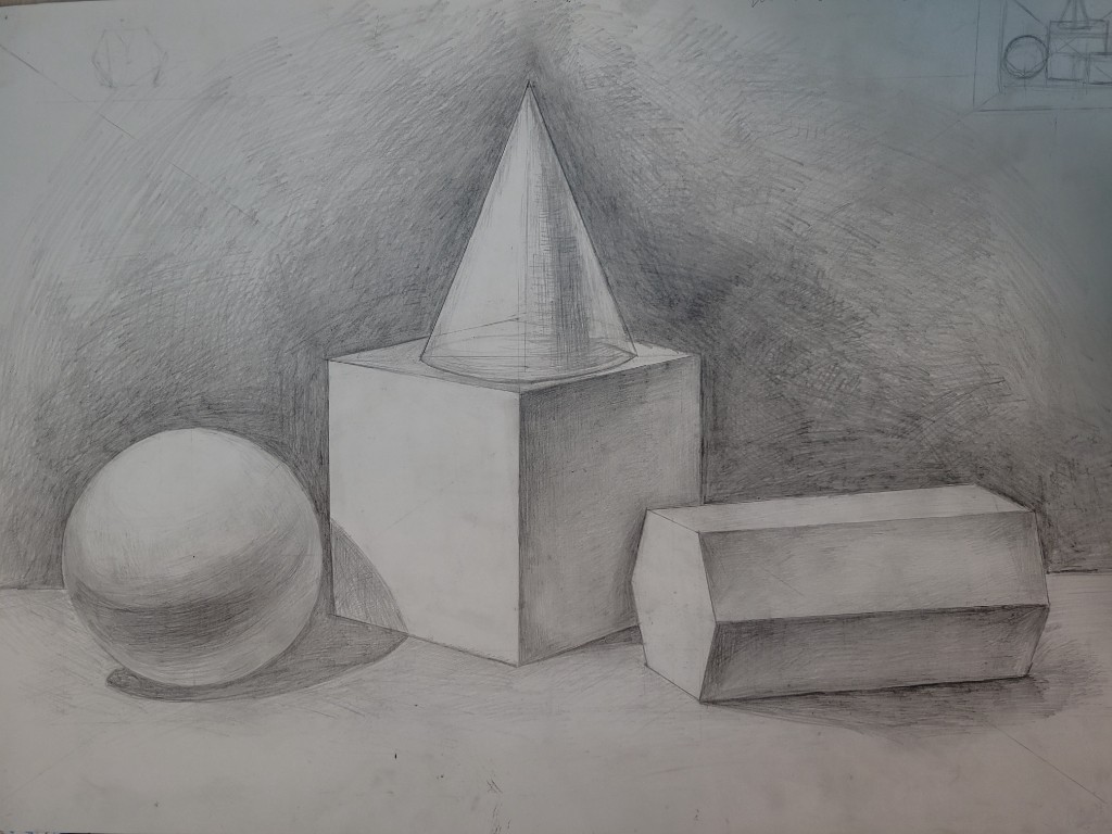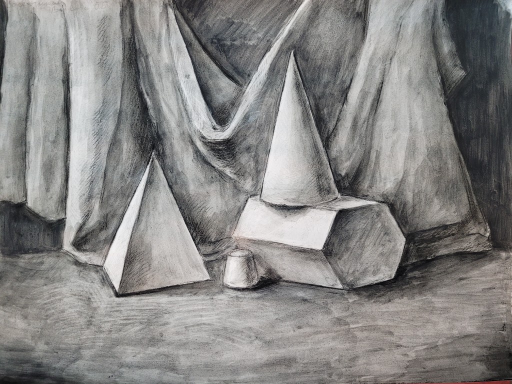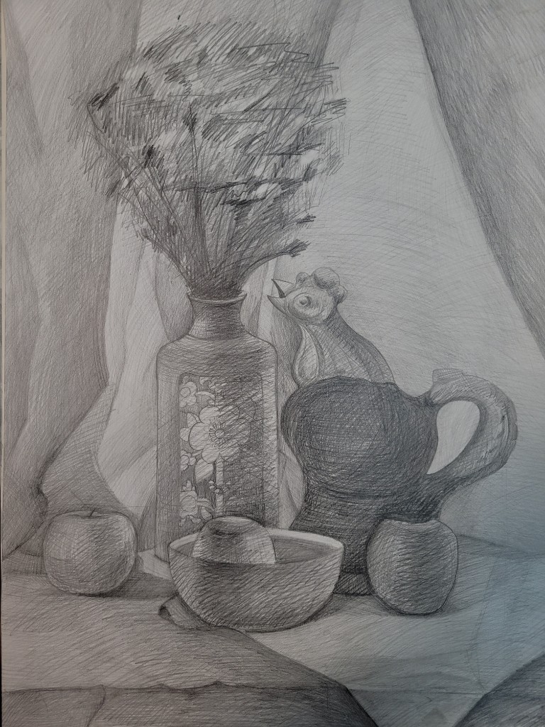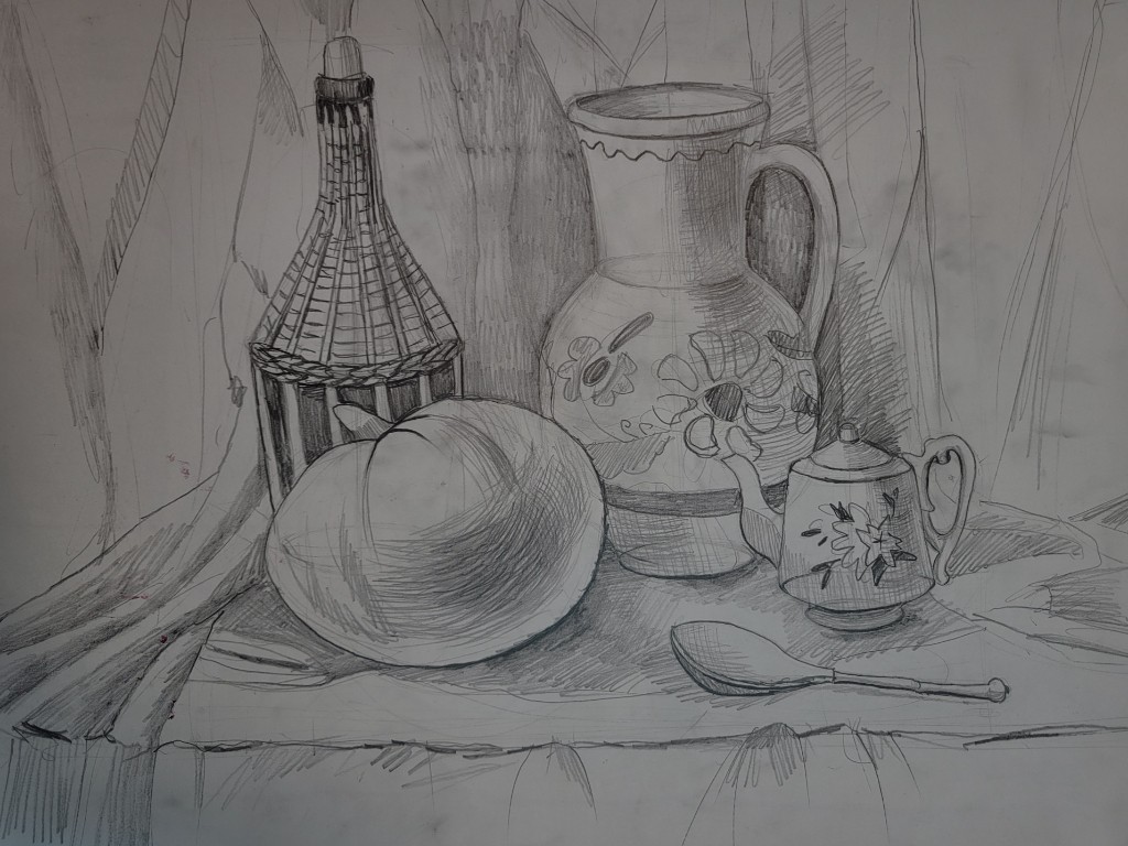 Работы созданы в техниках простого карандаша и соуса. Эти материалы позволили юным авторам решать сложные тональные задачи: от мягкой светотеневой моделировки до жесткой пластической проработки формы. В экспозицию вошли натюрморты из бытовых предметов, демонстрирующие понимание фактур и материальности, а также натюрморты из гипсовых фигур, где от учащихся требовалось точное конструктивное построение и владение анатомическими основами. Каждый лист — результат серьезной академической работы и шаг в освоении профессионального графического языка