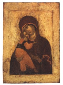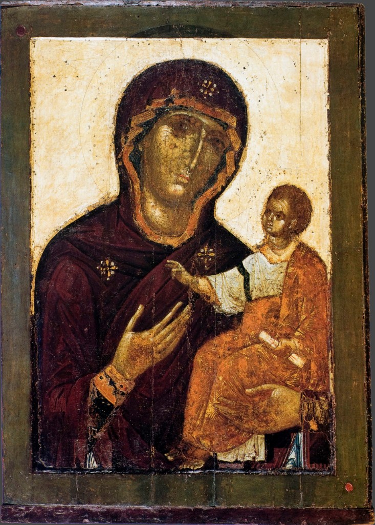 Богоматерь Одигитрия* (Перивлепта**). Двустороняя выносная икона из Успенского собора Московского Кремля. XII в.*(греч. — путеводительница) — один из самых распространенных типов изображения Богоматери с младенцем. Младенец сидит на руках Богоматери, правой рукой он благословляет, а левой — держит свиток);**(греч. περηυληπτος — видная всем, славная, известная))