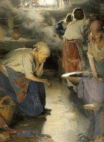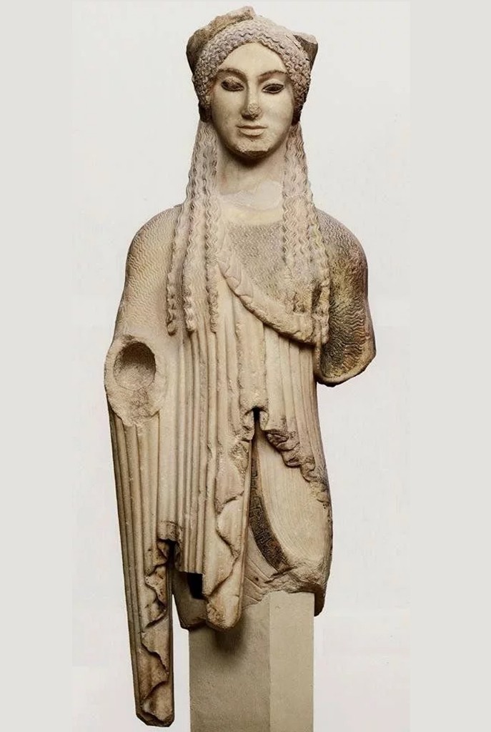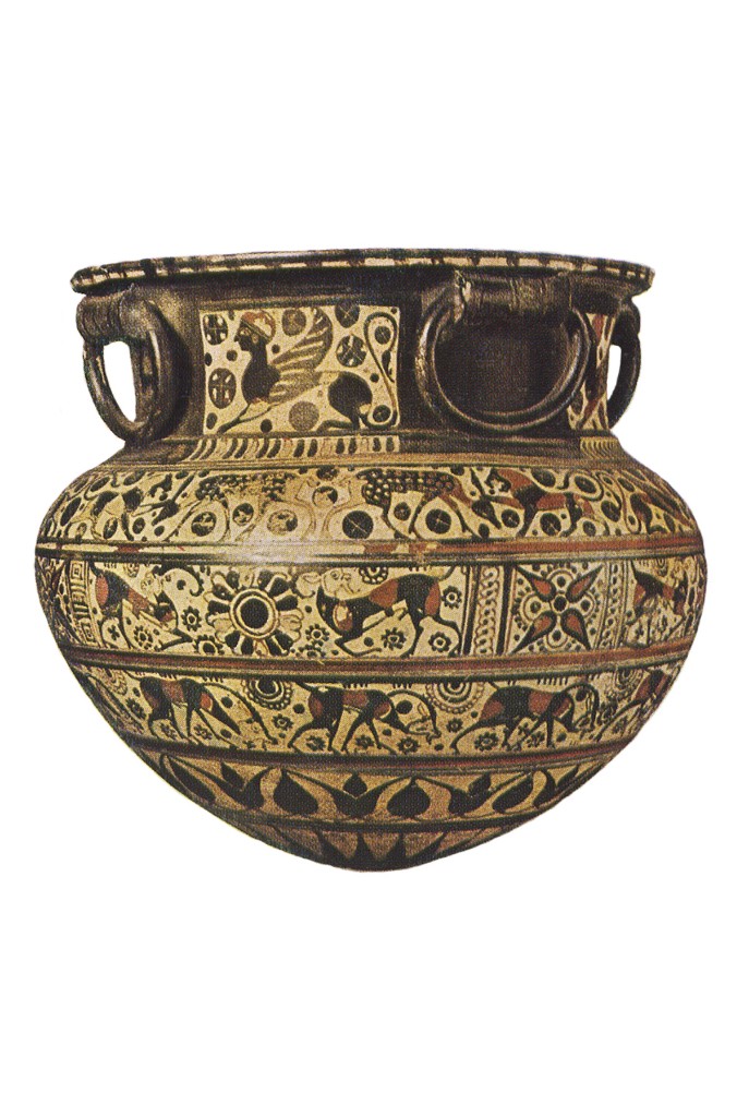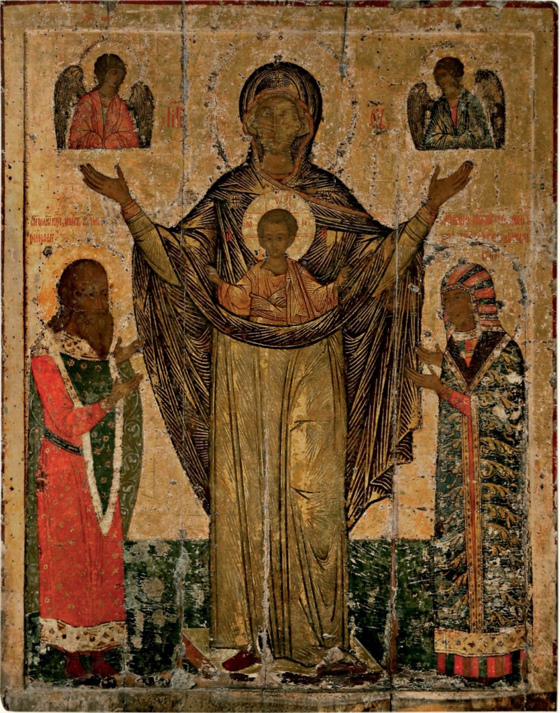 Икона. Богоматерь Великая Панагия* (Мирожская Оранта**). 1583 (?) год. Псков.(*(греч. παναγης — всесвятой, окруженный святостью); **((лат. — молящаяся) — один из типов изображения Богоматери, представляющий Богоматерь в рост, с поднятыми и раскинутыми в стороны руками ладонями наружу, т. е. в традиционном жесте заступнической молитвы)