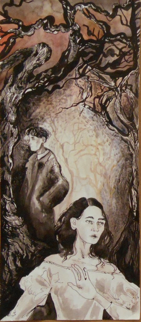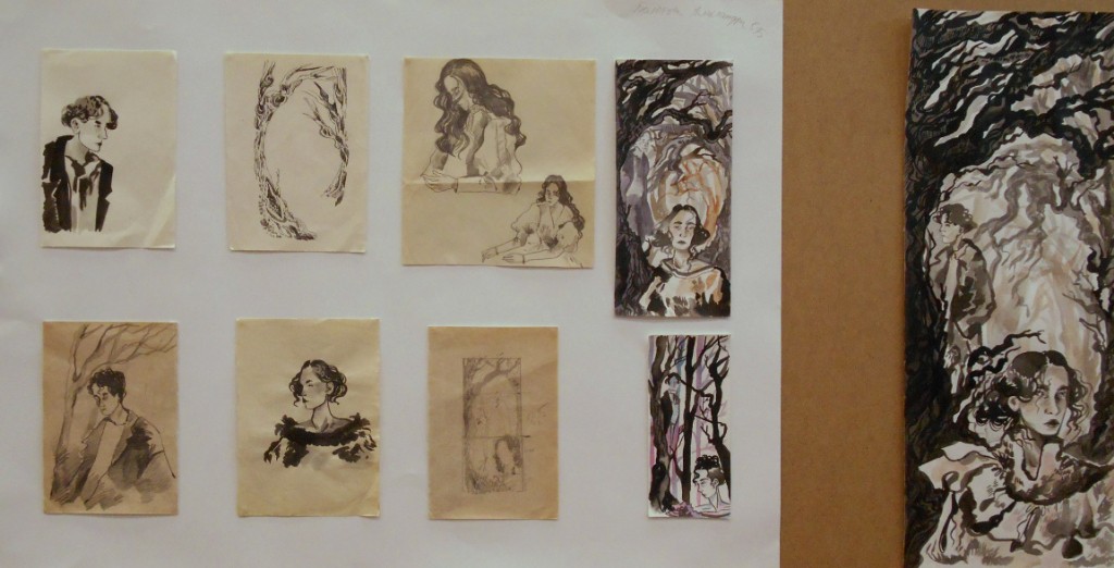 - разработка образа героя ведется не только через мимику, но также через жест, поворот, силуэт, пятно, знак, окружение – в ряде случаев это позволило избегнуть «литературности» в трактовке композиции (Болотова Александра, графика по мотивам романа А.С. Пушкина «Евгений Онегин», рук. Баженова; Коржова Лилия «По мотивам А.Н. Толстого «Хождение по мукам»», рук. Исмаилова Л.С., Тамбовцев Савва «Петербург в произведениях Достоевского», рук. Исмаилова Л.С., Баранова Анастасия «Письмо с фронта. К 75-летию Великой Победы»; рук. Глущенков В.А.; Мельникова Маргарита «Студенты перед сессией», рук. Глущенков В.А., Половова Екатерина «Благоустройство», рук. Глущенков В.А.)