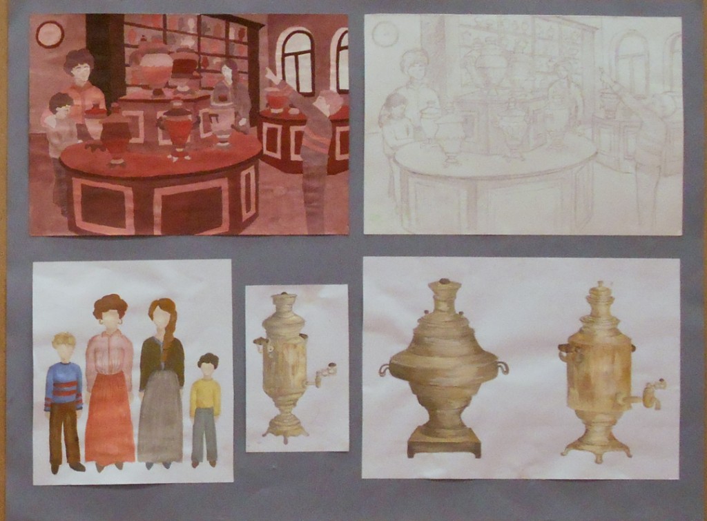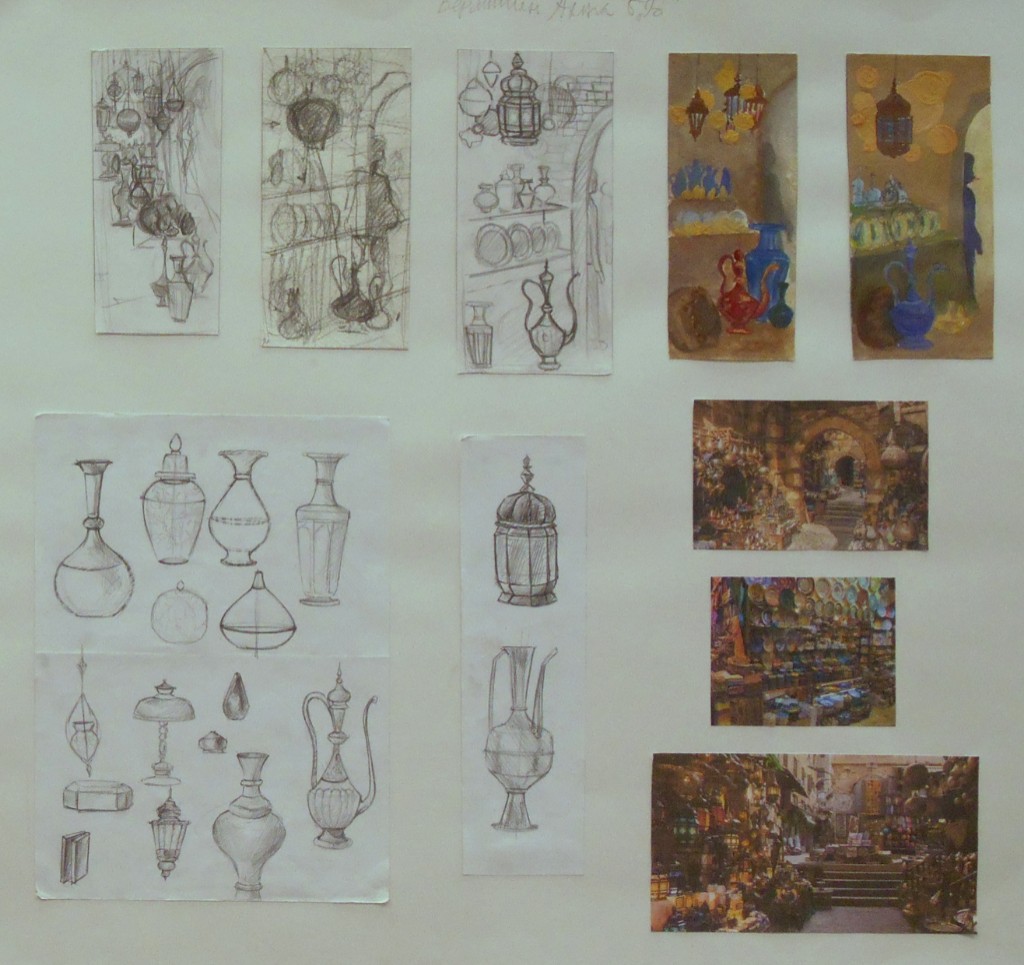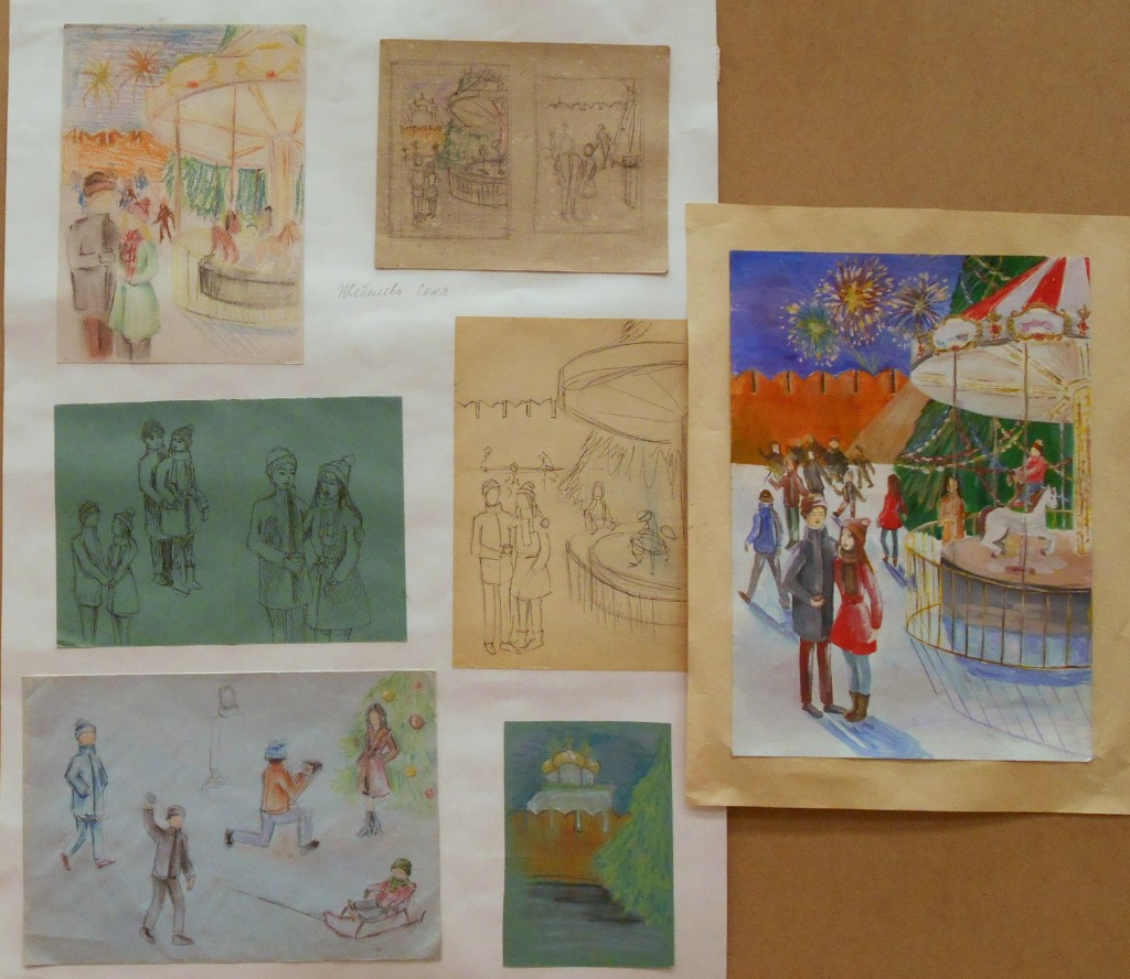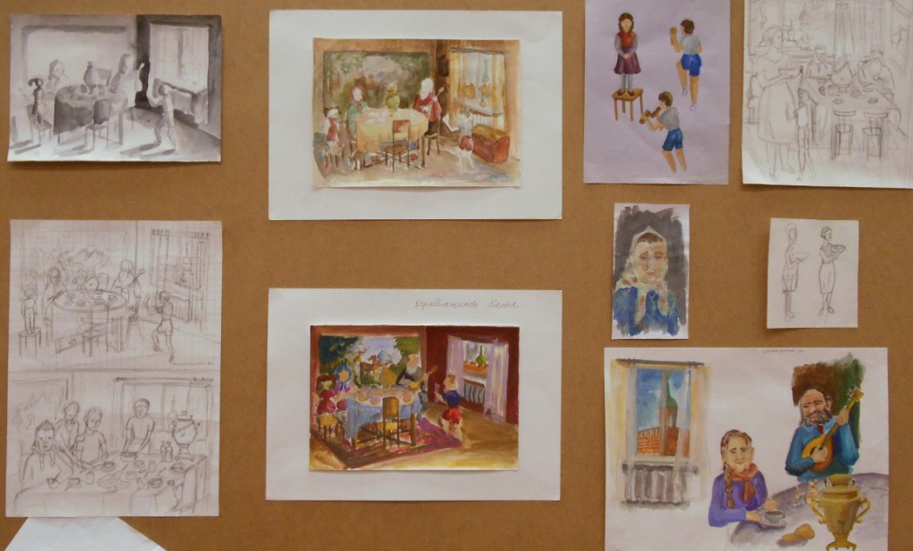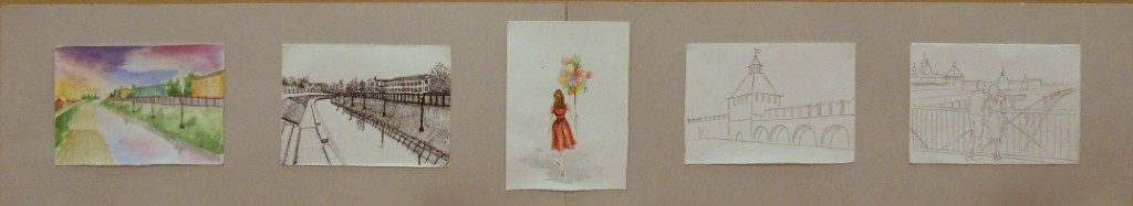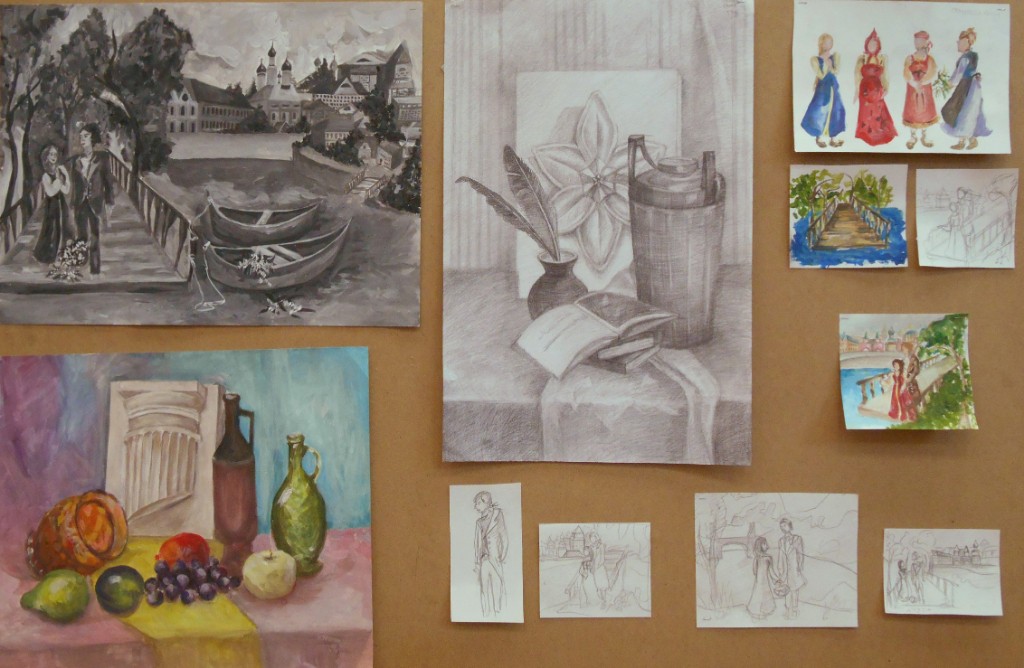 – особое внимание уделено грамотному композиционному эскизированию, который начинается от поиска равновесия и гармонизации цвето-тональных пятен, масс в листе, разработки большого количества абстрактных клаузур, что позволяет грамотно организовать лист на выходе (Вермищян Анна «Восточные мотивы», рук. Баженова Т.Ю.; Ильина Ангелина «В музее самоваров», рук. Тараторкина Н.С.; );