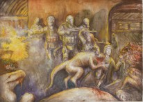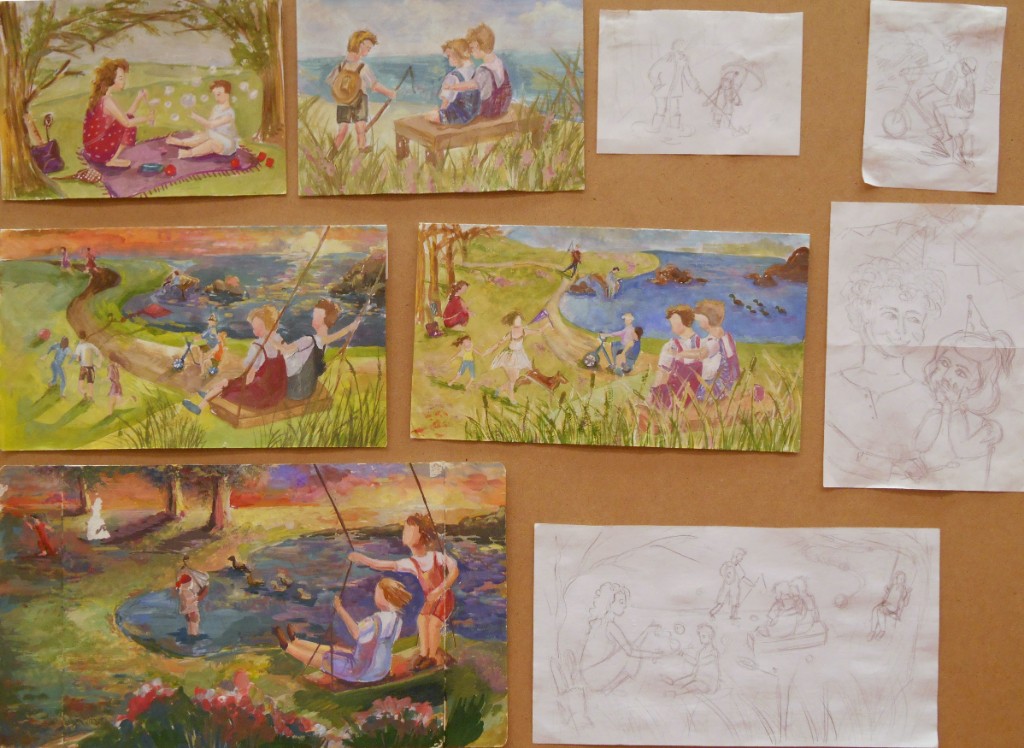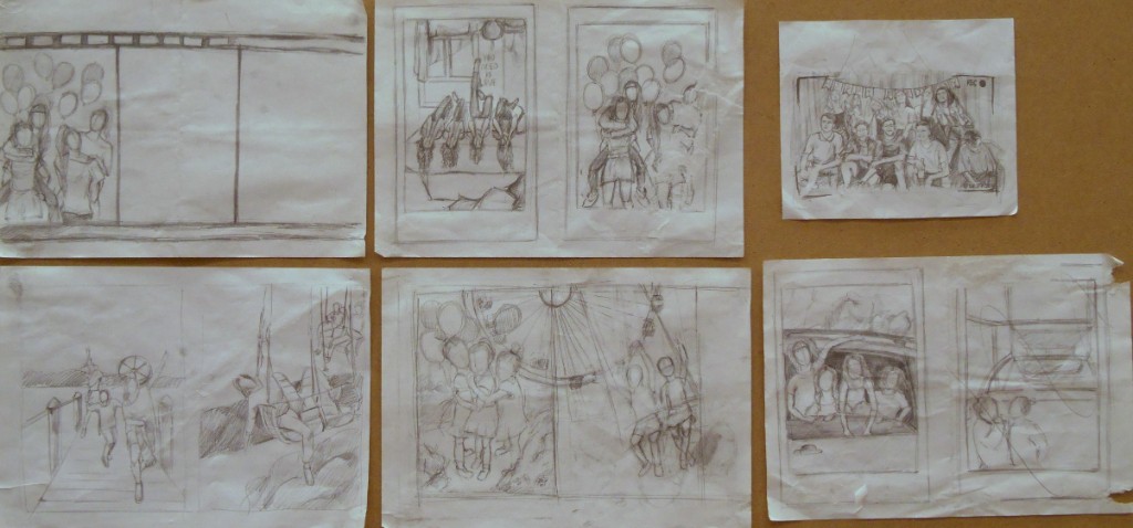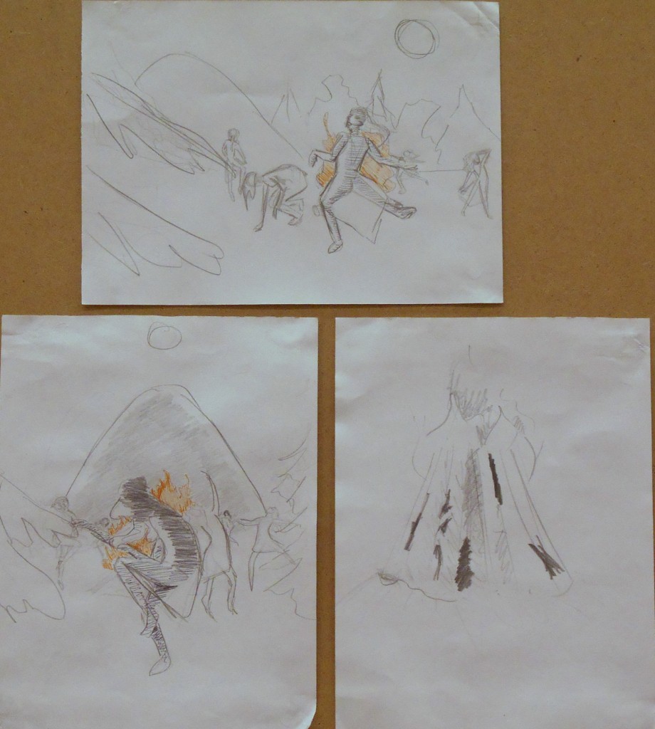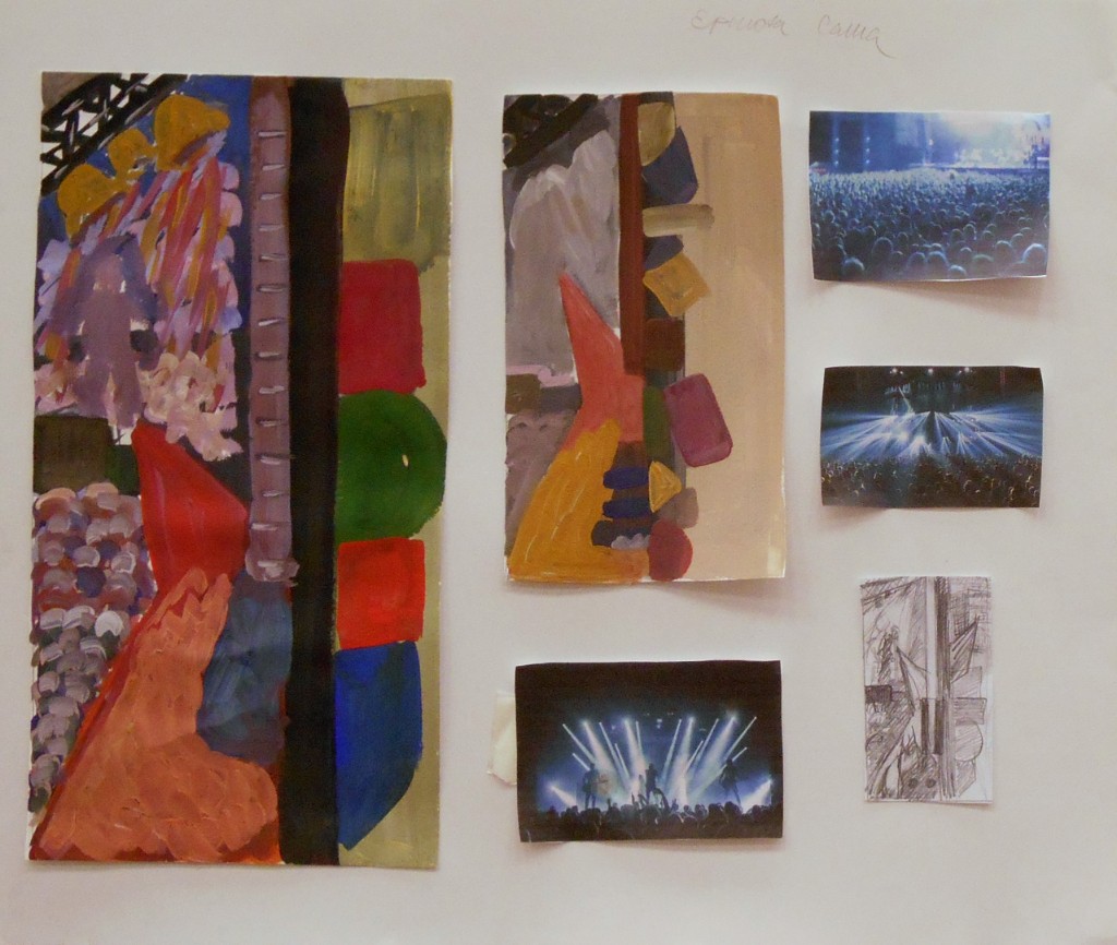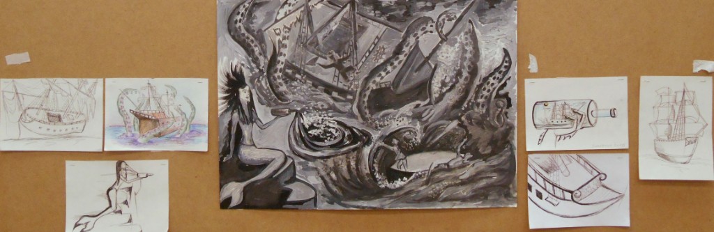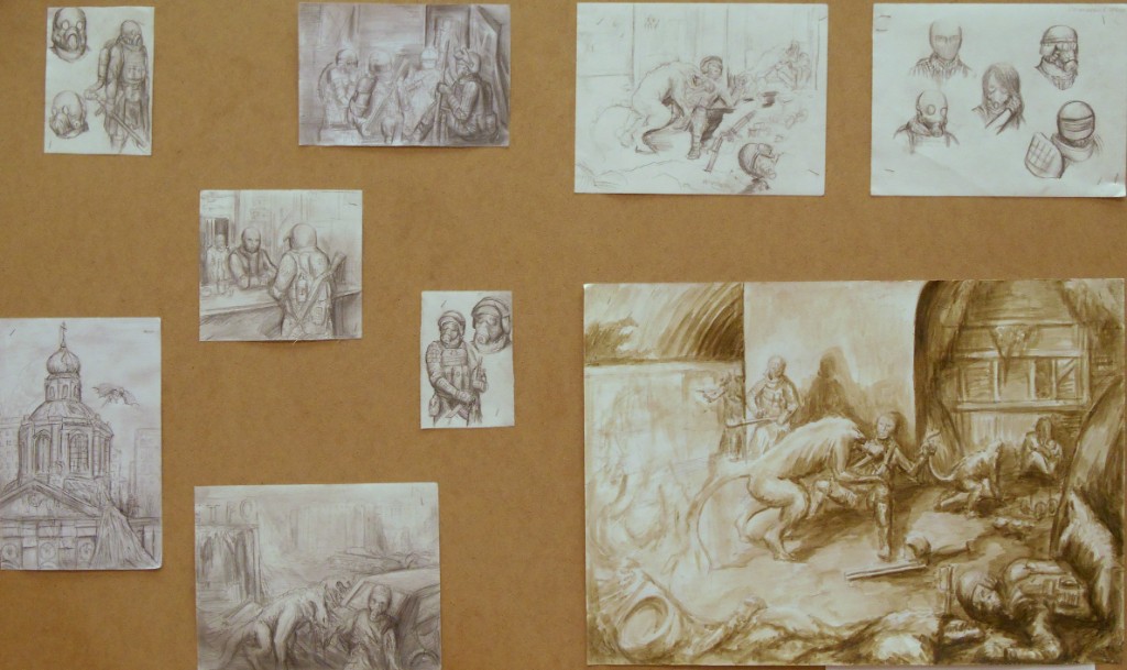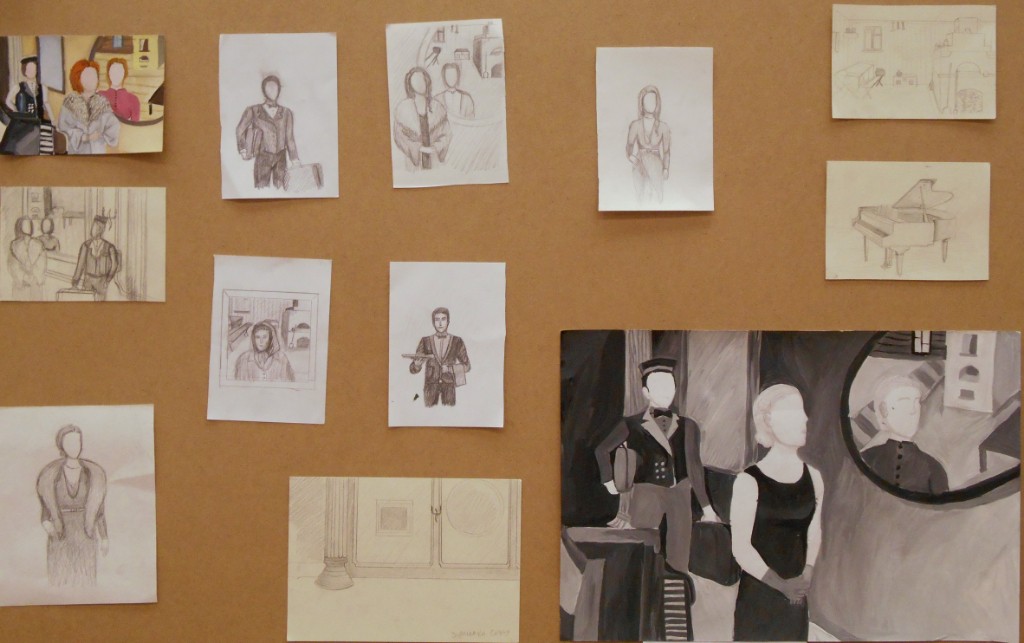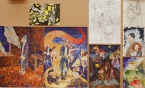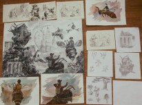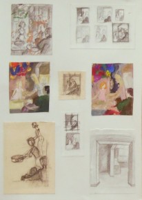 - разработка композиции ведется в нескольких техниках, что позволяет более грамотно выбрать цветовое решение на выходе и определить наиболее эффектные пластические мотивы (качественно выполненные гризайлью подготовительные картоны в экзаменационных материалах учащихся Ковалевой И.Г.)