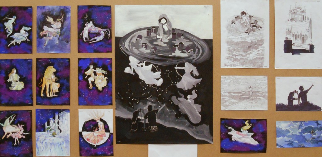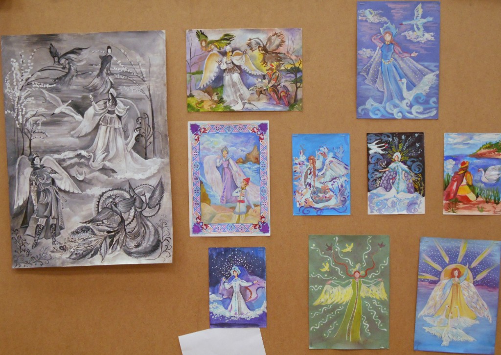 - активное использование декоративных возможностей линии, пятна, фактуры, графических возможностей орнамента, стилизация формы для создания необходимого художественного образа (работы Шабро Дарья, Огневой Анастасии, Гришиной Яны, выполненные под руководством Ковалевой И.Г., Комаровой Марины/руководитель Исмаилова Л.С., Михайловой Ангелины/рук. Глущенков В.А.)