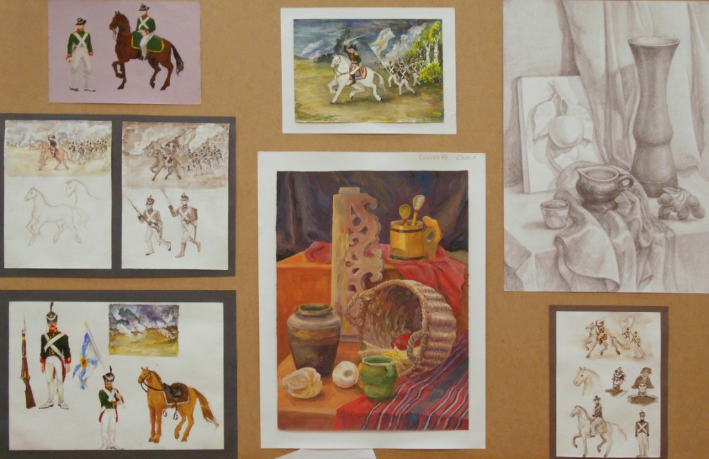 - грамотный сбор аналогов и прочего вспомогательного материала к композиции, фотофиксация, этюды, наброски, разработка костюмов персонажей, деталей в композициях на историческую тему ( «Бородино» Елисеева Екатерина, «Традиции тульских мастеров. Как зарождалось кузнечное ремесло в Туле», Токмакова Дарья, рук. Тараторкина Н.С.; «Животные - солдаты Великой Отечественной войны», Комарова Марина, рук. Исмаилова Л.С.)