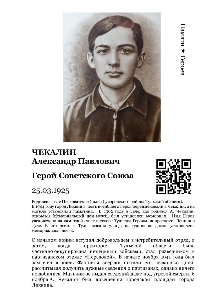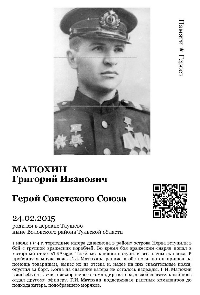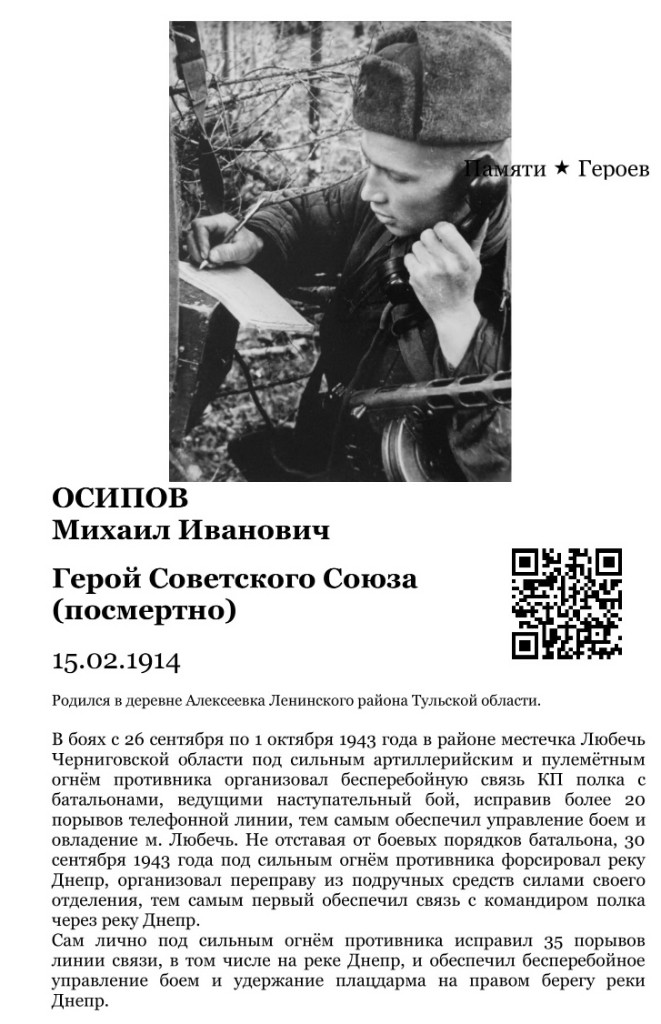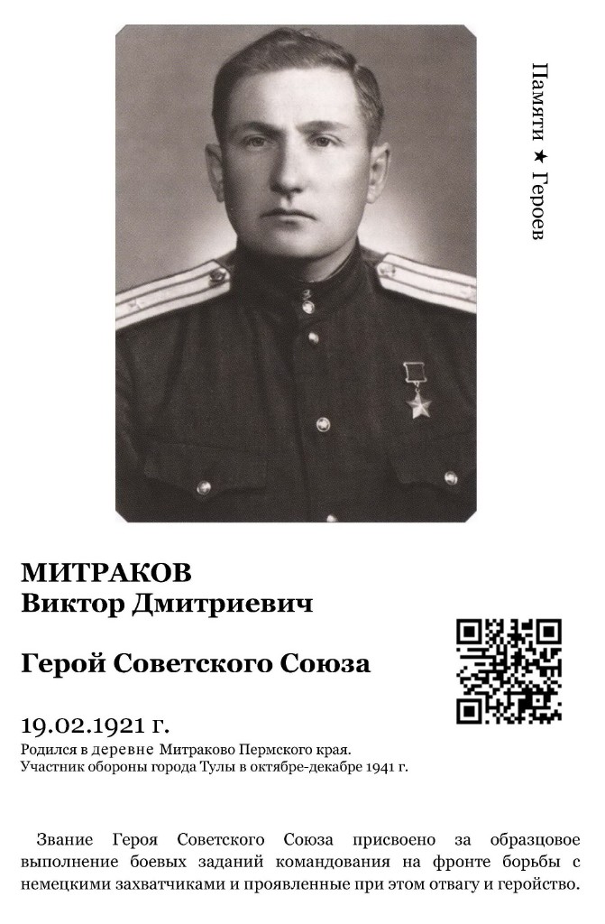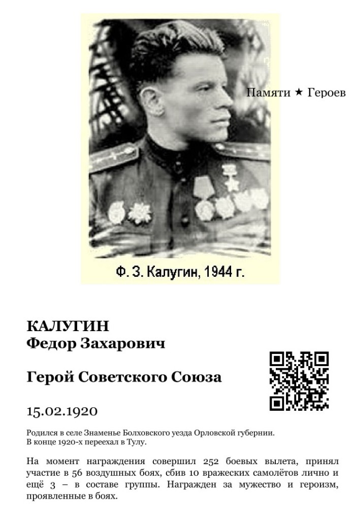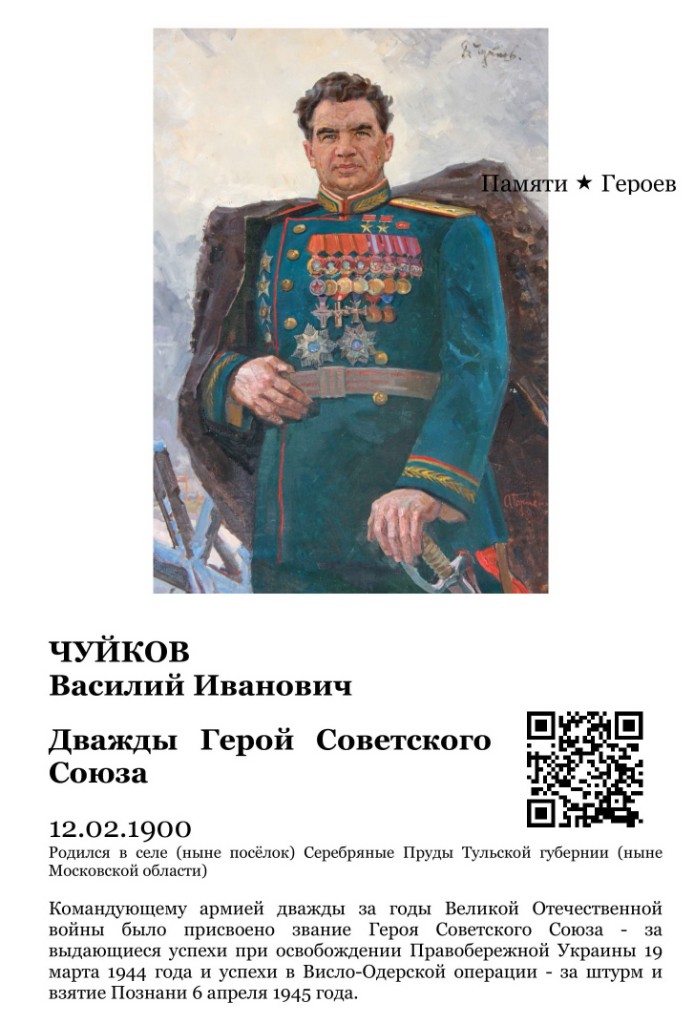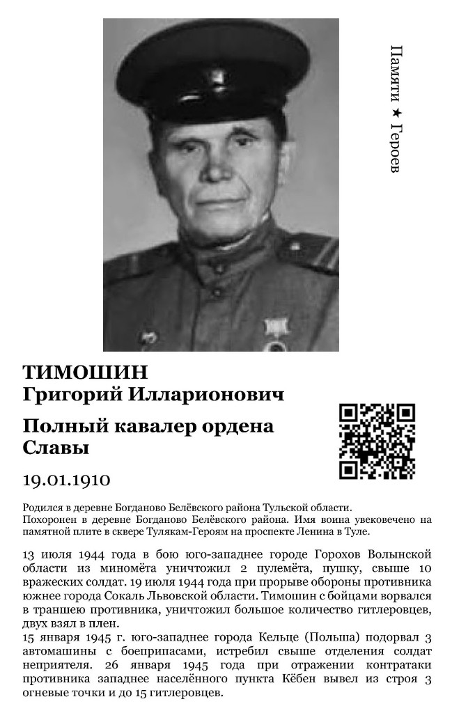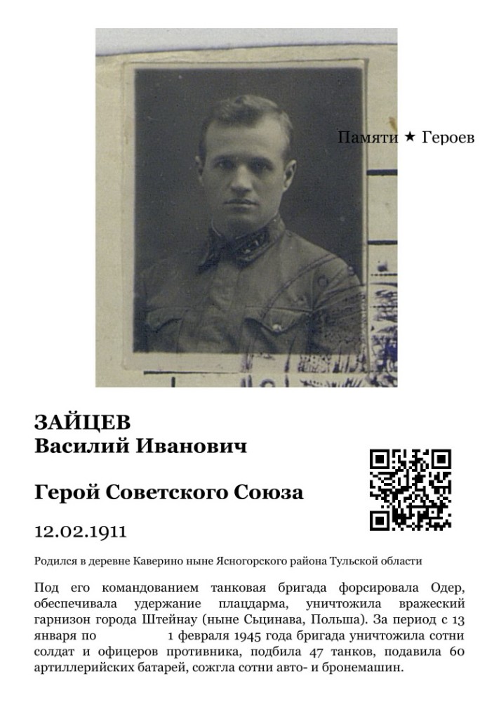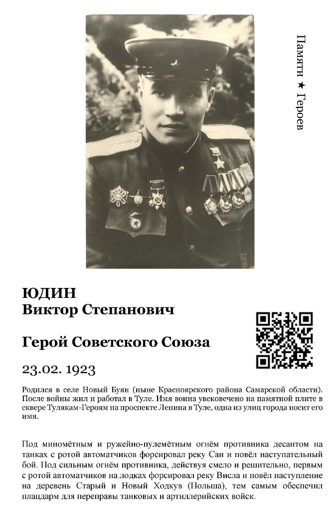В рамках проекта в Туле подготовлены и размещены плакаты с фотографиями и биографиями Героев Советского Союза, Героев Российской Федерации - участников Великой Отечественной войны, полных кавалеров ордена Славы, родившихся, проживающих и проживавших на Тульской земле. Каждой фотографии присваивается QR-код, который ведет на видеоролик с рассказом о герое.